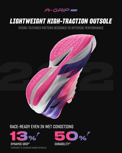 And while performance is the name of the game, the C202 6 keeps durability in mind—a generous coverage of our A-GRIP PRO rubber outsole to give runners a shoe that they can count on through a packed season of racing, and micro-textured for added traction even in wet weather.